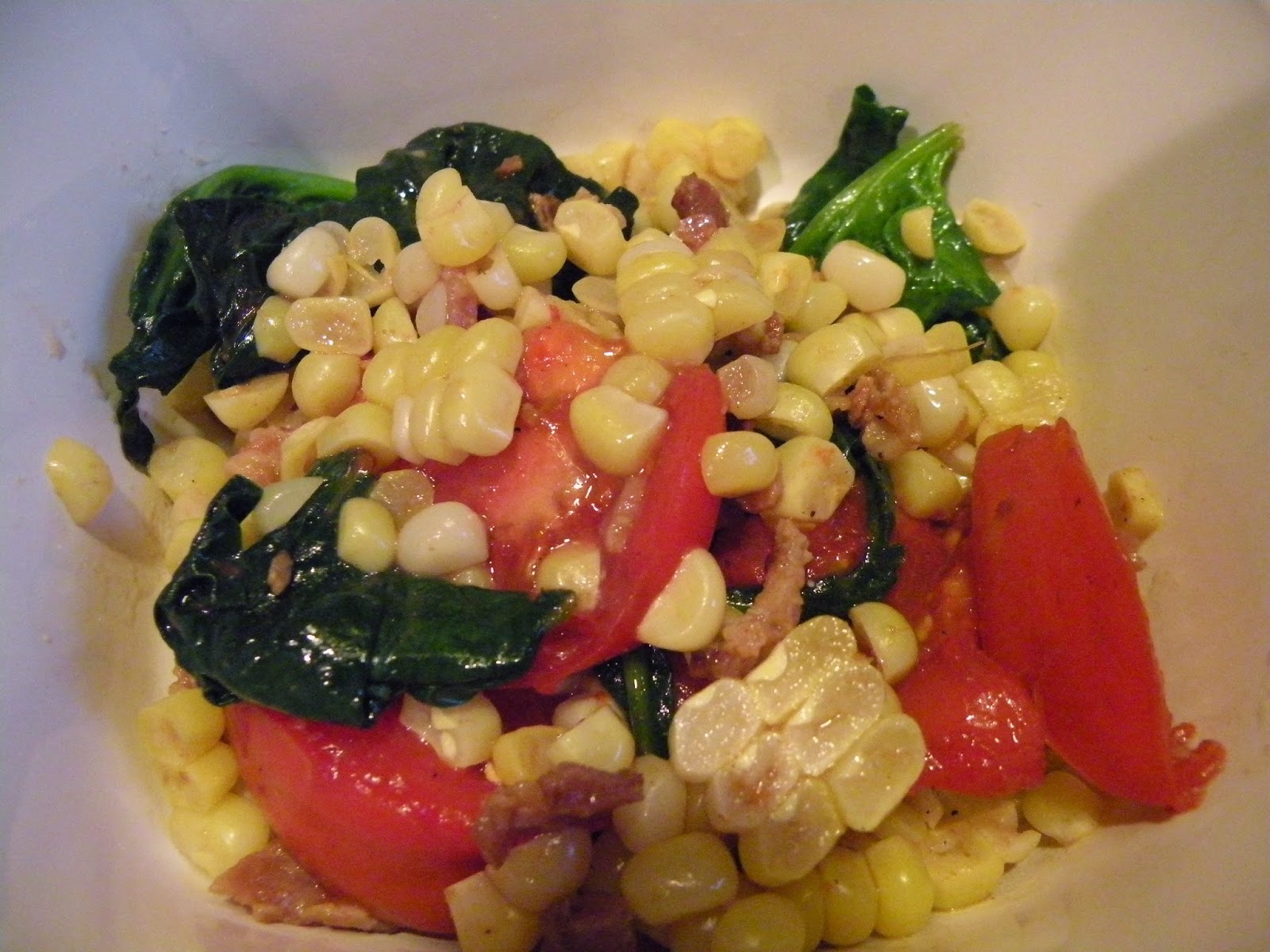 Fry bacon on low or med-low heat until to desired doneness. Remove and drain on paper towels, than crumble. Leaving the bacon fat in the pan, turn the heat to medium. When the pan is hot, throw in the greens (as much as you like, really), and stir-fry till almost wilted. Throw in the tomato slices and cook until the greens are dark and soft. Remove from heat.