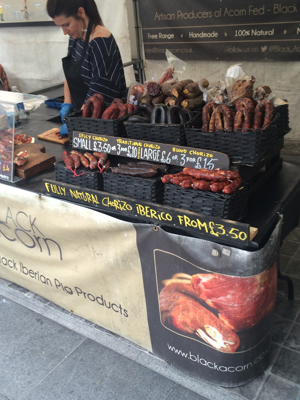 While our Bellevue Farmers Market boasts wonderful meats--beef, chicken, pork, sausage, bacon, and so on--somehow we still don't offer "Iberian Pig Products," even though that name is a goldmine. Note the black sausage on the top shelf! And forget "corn-fed"--these Iberian pigs are acorn-fed.