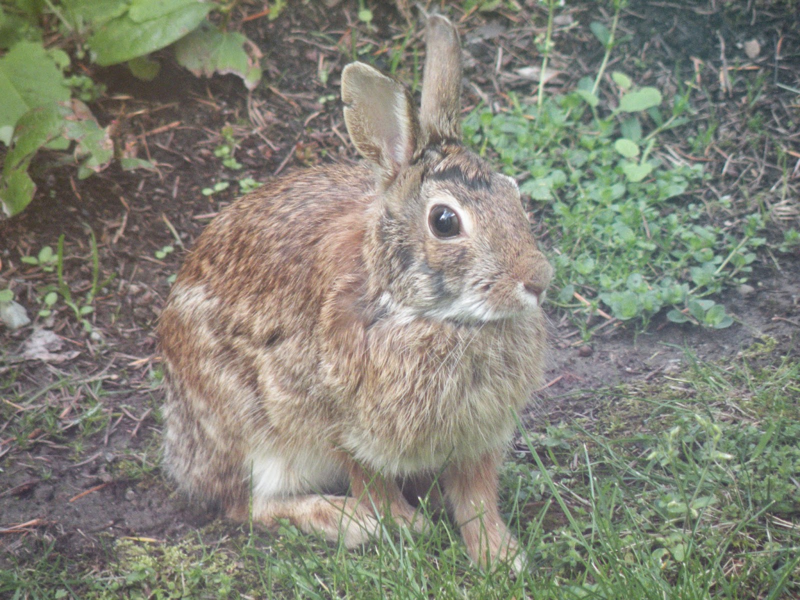 Yesterday we spied this fellow in the yard. He looks a little the worse for wear, but I imagine that's because he's had to survive on grass and the neighbor's flowers alone, for the past few months. And he's been holding his little rabbity breath for the moment when my husband puts in the seedlings and plant starts, so he can gnaw them down to the roots and put some variety in his diet. Worse yet, my animal-loving daughter spied a second rabbit by the deck.