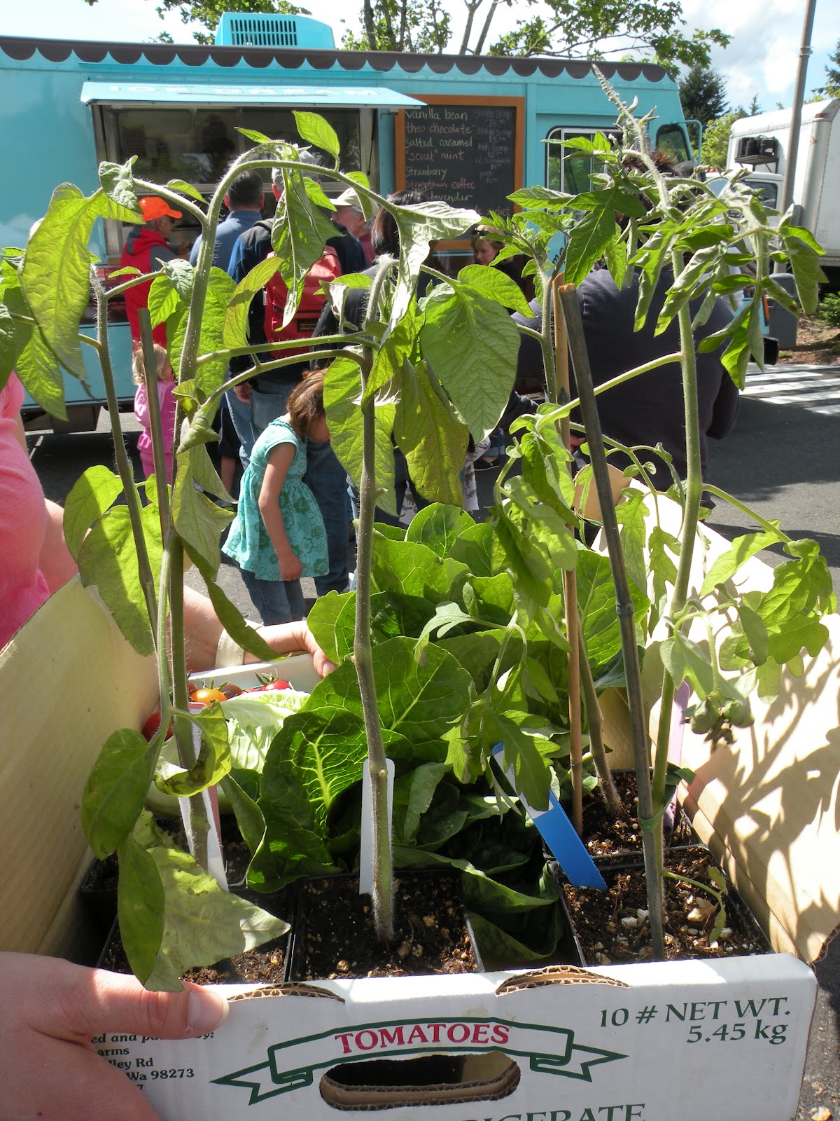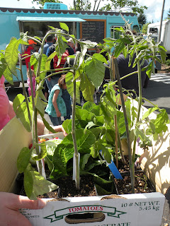 We didn't make it far from The Box--about ten steps to the Molly Moon truck, in fact--before I ran into Leslie, a fellow mom from my children's elementary school, who was carrying a box of tomato starts, all sorts I'd never heard of that she'd found at Hedlin Farms. Following her lead, I swung by and picked up a variety called "Stump of the World," which, according to the gals at Hedlin, yields a "bushy plant with Brandywine pink fruit as big as your head." In other words, stake this puppy well.