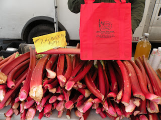 After the eight-year-old licked her ice cream scoop right off the cone onto the pavement (I applied the ten-second rule and a napkin from Reis), we ventured down to Rockridge Orchards to buy the absent twelve-year-old some fresh cider as a guilt offering. There, the display of rhubarb caught my eye: