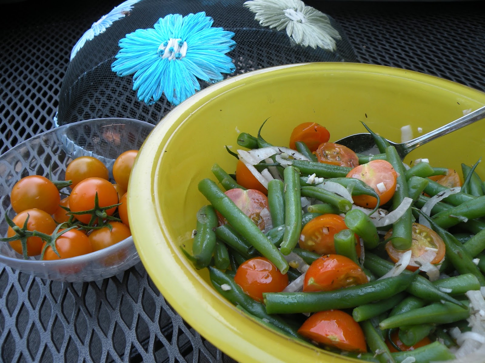 But back on our side of the mountains we have plenty of goodies left to enjoy, including salads like the one I make (pictured above) with cherry tomatoes, green beans, onions, and dill, in a vinaigrette. Everything but the dill you can find at the Market, and sometimes even the dill! Otherwise, dried works just fine.